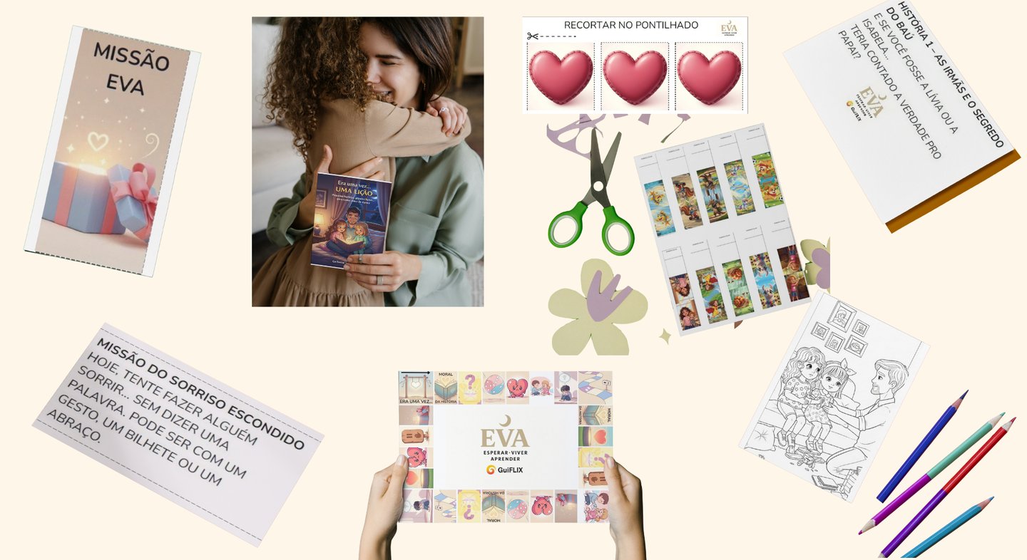 O Ritual EVA é um método simples em 3 etapas — Esperar, Viver e Aprender — que transforma a hora de dormir em um momento de conexão entre pais e filhos. Você recebe o curso completo em vídeo, o livro digital, os flashcards, cartas, ilustrações para colorir e até um jogo exclusivo para aplicar na prática.
