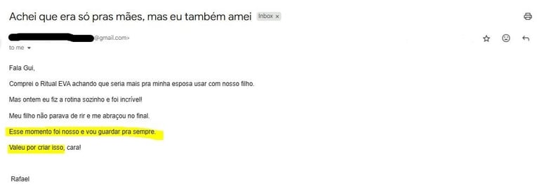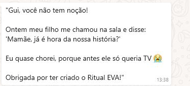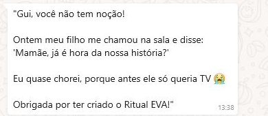 Não. O EVA não exige horas do seu dia. O segredo está na constância e não na duração. Em poucos minutos antes de dormir, você consegue aplicar o ritual e colher resultados de vínculo, calma e conexão com seus filhos.
