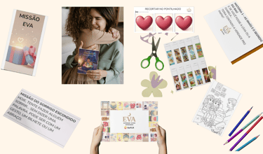 Você terá acesso imediato à área de membros com o curso em vídeo, o livro digital completo, páginas para colorir, cartas, flashcards, missões EVA e o jogo completo para imprimir (tabuleiro, peões, cartas e corações).